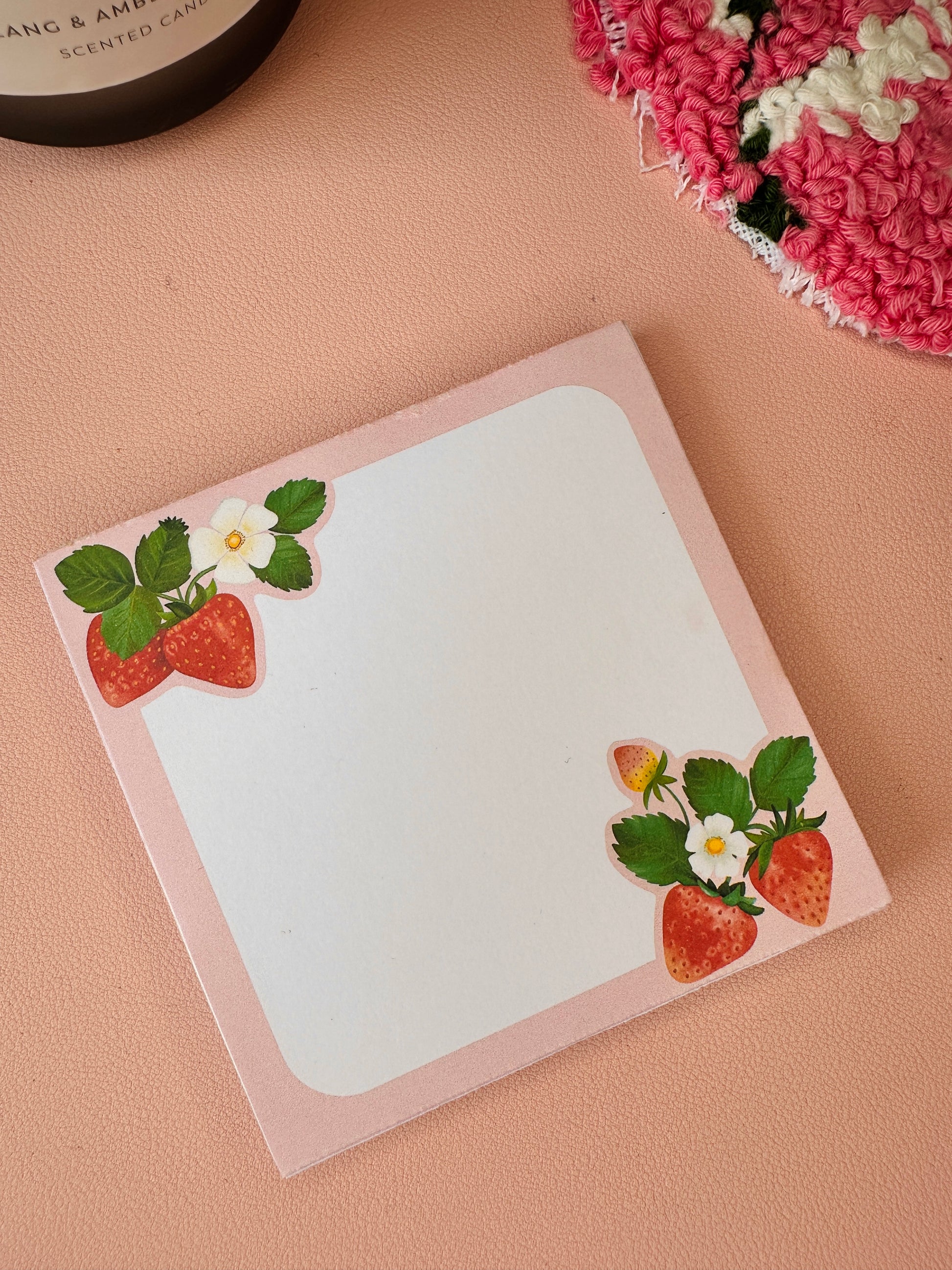 Adorned with whimsical strawberry designs, this pocket-size marvel effortlessly captures the essence of summer. It's not just a desk pad; it's a cute companion for your note-taking adventures, whether you're jotting down ideas or penning a quick thank-you. Its compact size makes it the perfect travel buddy, fitting seamlessly into any bag or pocket.