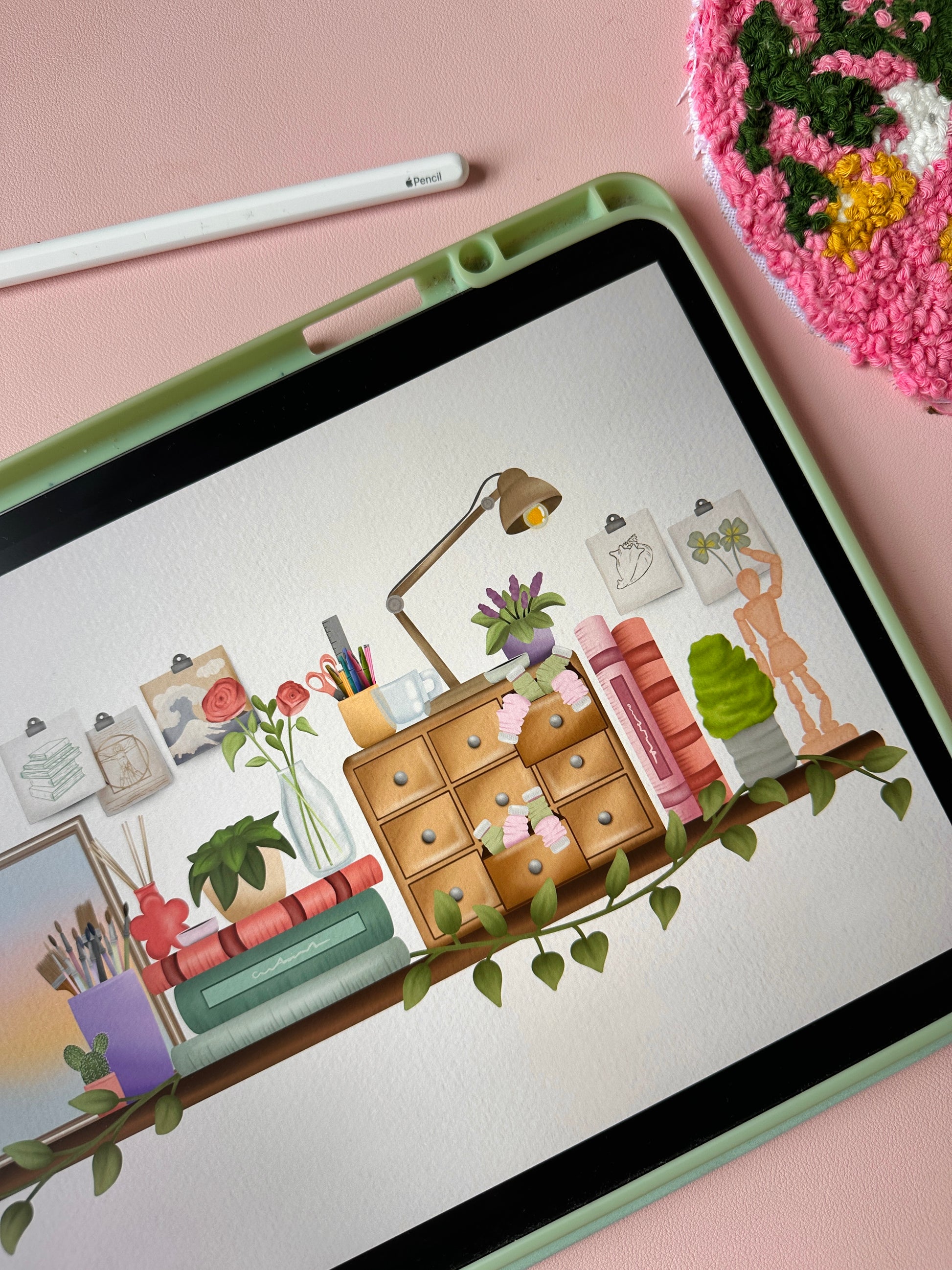 Transform your creative space into a charming gallery with delightful artists shelf print. This cute piece capture the essence of a painters dream, blending whimsy with artistry in every pastel stroke.