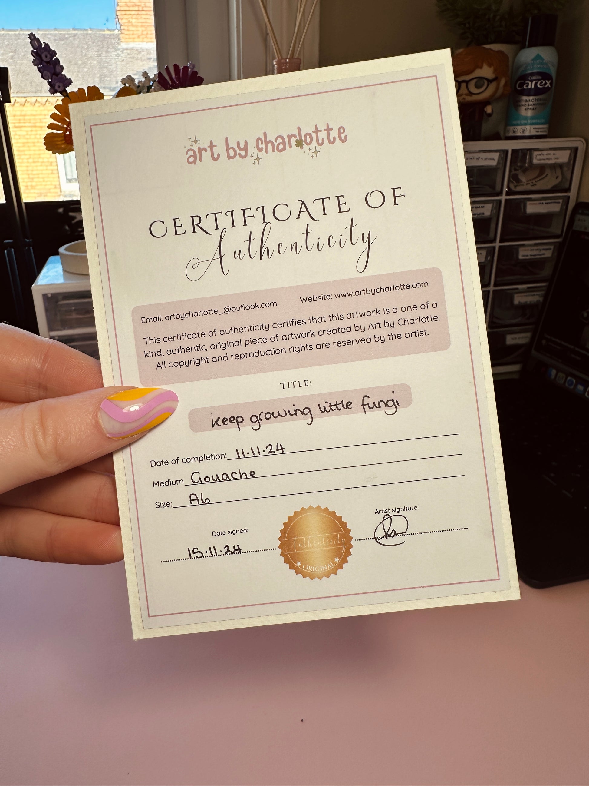 Handcrafted with love and care, this 'Keep growing little fungi' mini original is a must-have for any art lover. Don't miss out on the opportunity to own a piece of nature-inspired art that will bring joy and beauty to your home.