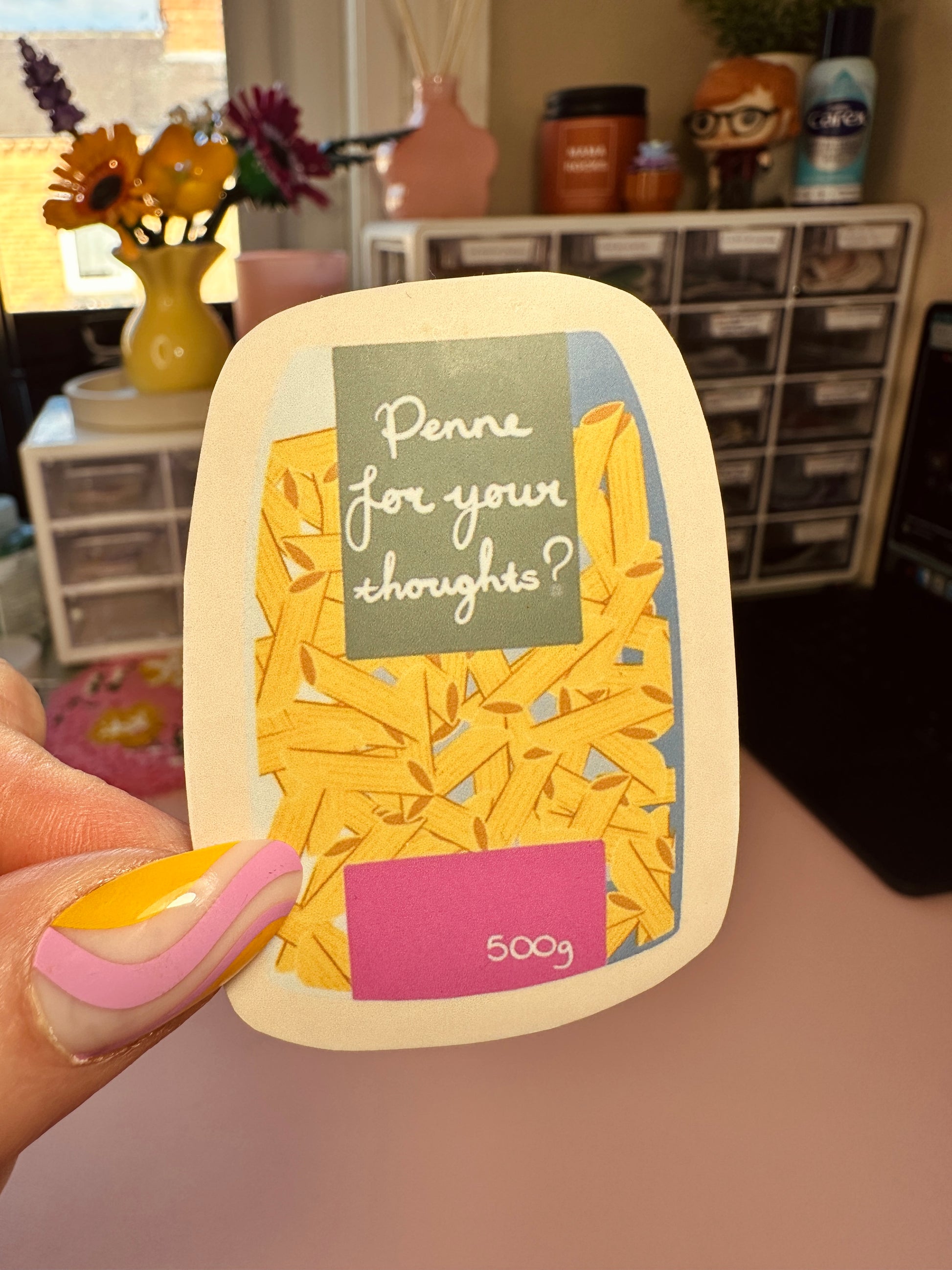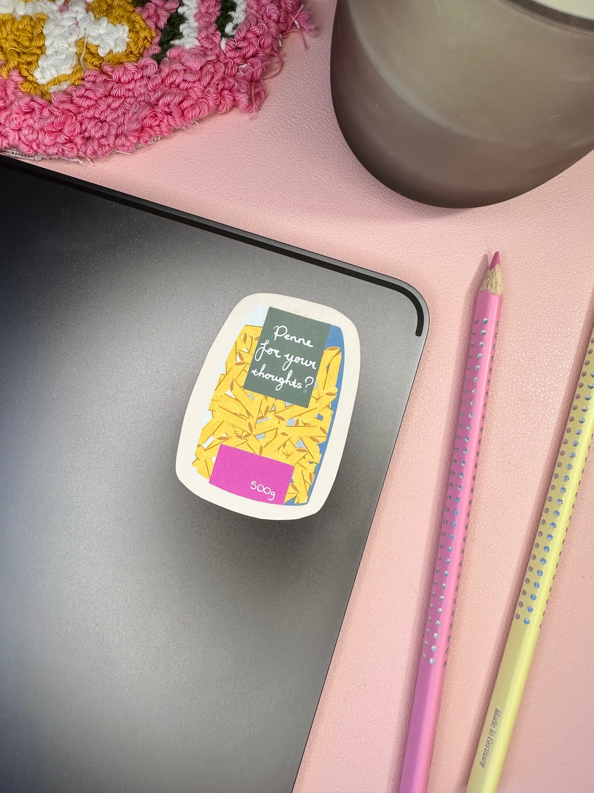 Enhance your sticker collection with the 'Penne for your thoughts' sticker. This witty and humorous penne-themed sticker will surely make you smile. Made with high-quality material, it's perfect for adding a touch of fun to your belongings. Let your creativity flow with this punny sticker.