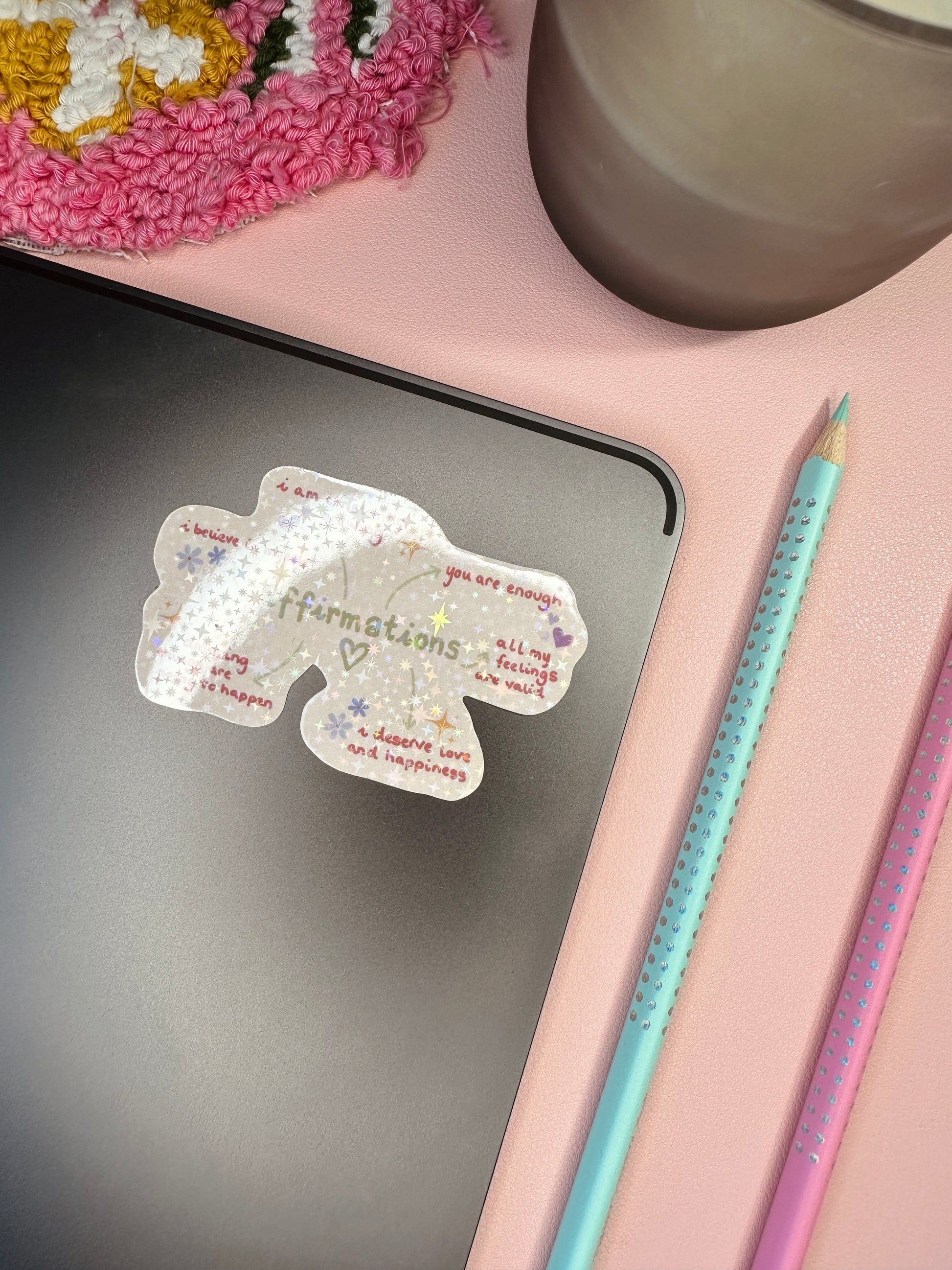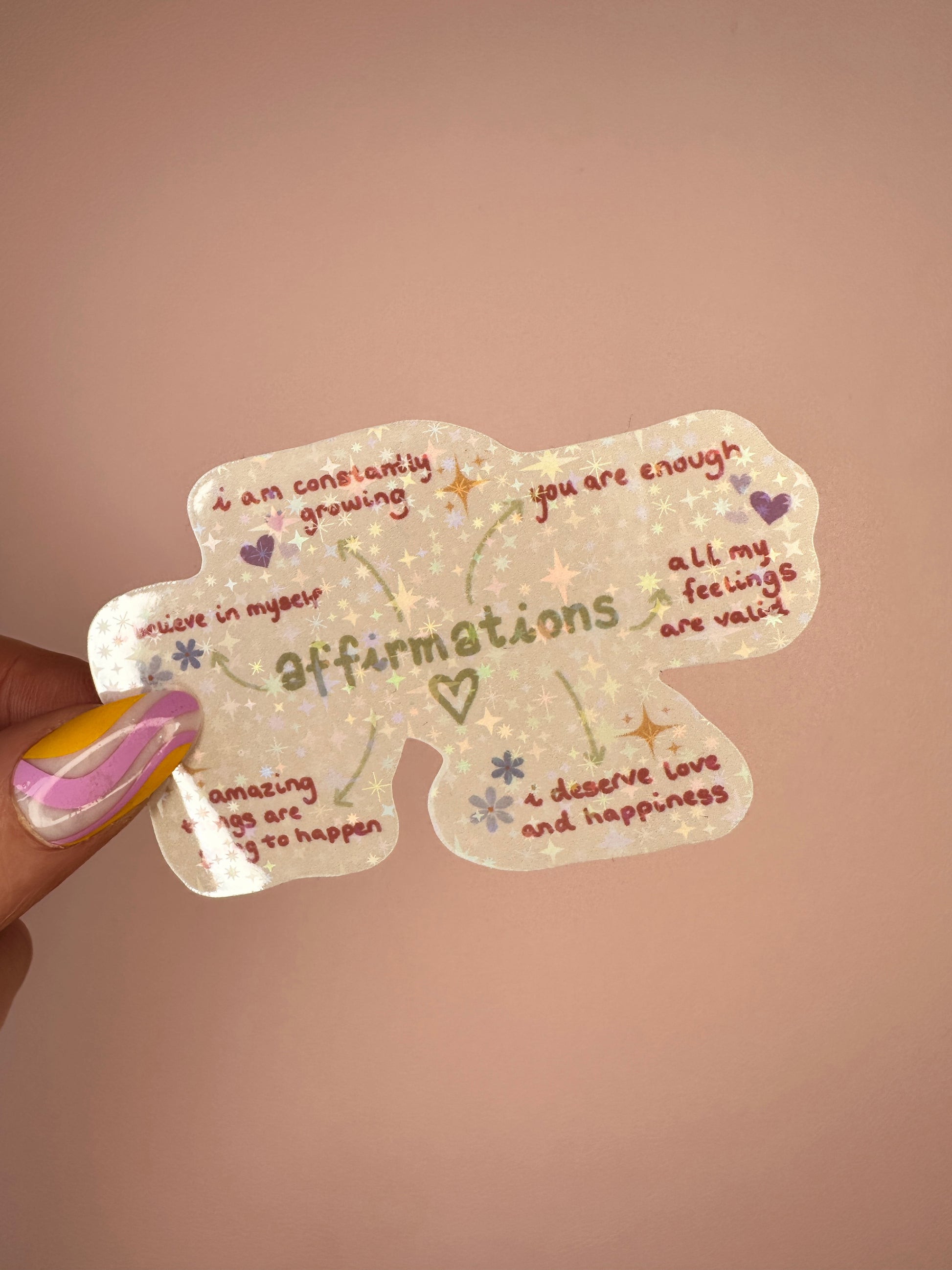 This fun sticker features multiple affirmations to empower and uplift you throughout the day. With a star holographic laminate on top makes this sticker extra special
